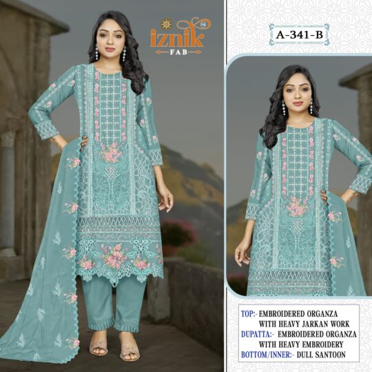 Iznik fab a341 present new launching heavy organza with embroidery work collection wholesaler and manufacturer in Surat