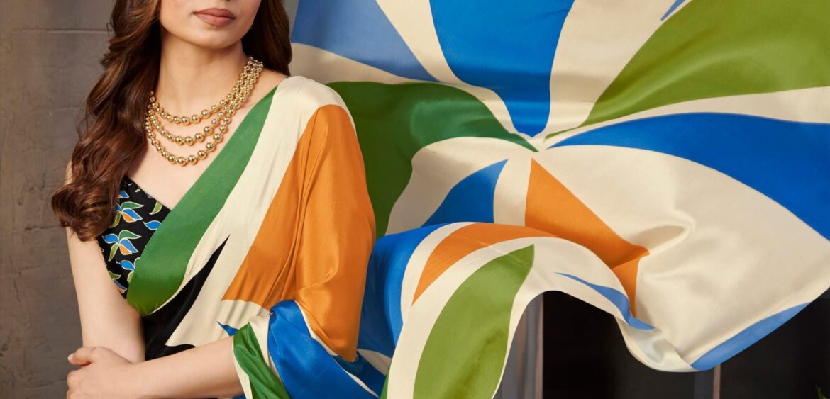 MC brand Ajrakh 011 saree presenting new model satin print collection wholesaler and manufacturer in Surat