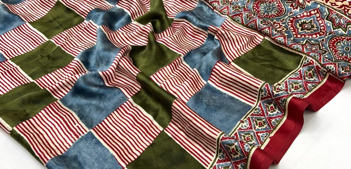 MC brand Ajrakh Luxe present new launching print Ajrakh satin crepe collection wholesaler and manufacturer in Surat