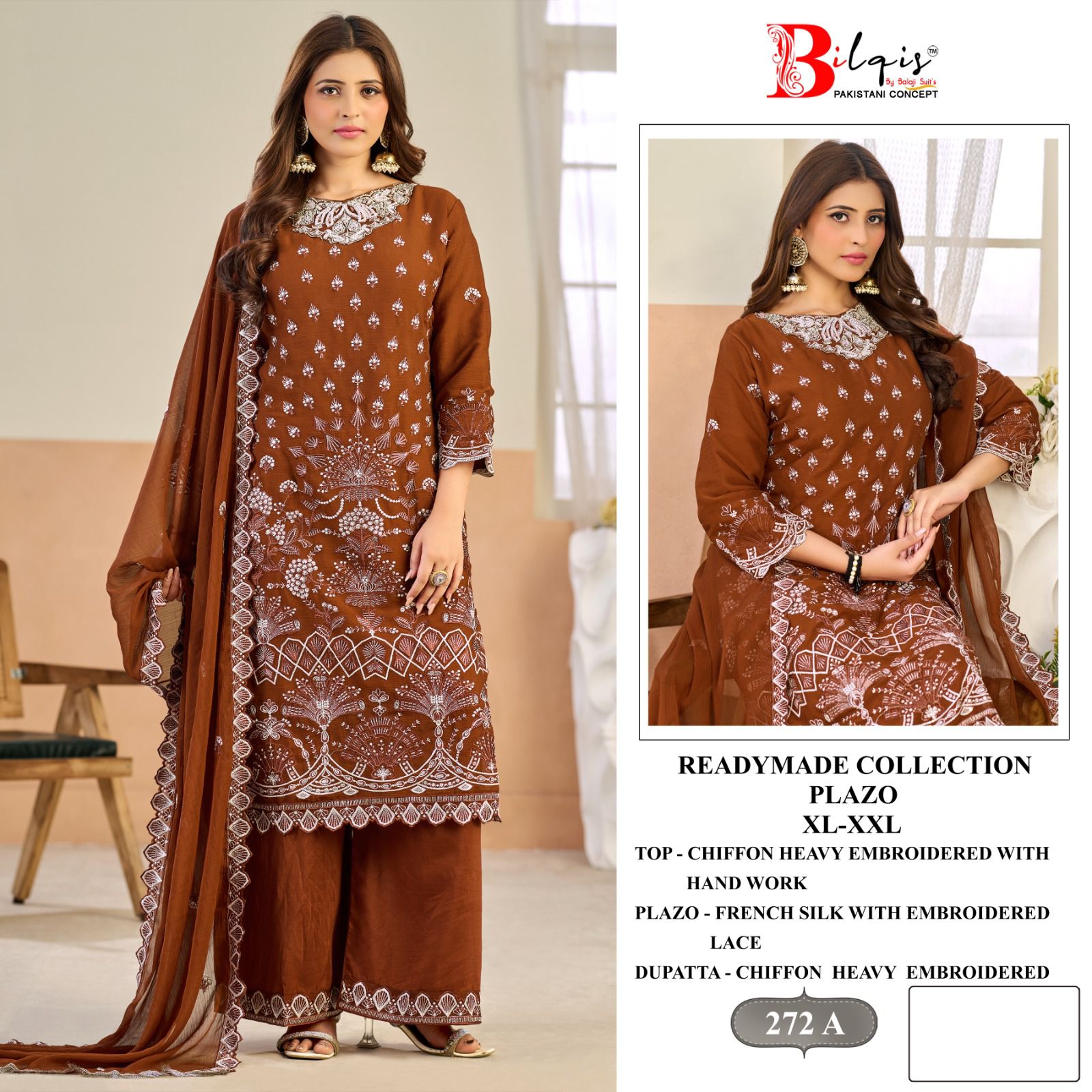 *BRAND – BILQIS*™️ *READYMADE COLLLECTION* *D NO -* B-272 A TO D *TOP -* CHIFFON HEAVY EMBROIDERED WITH HANDWORK *SIZE -* XL,XXL *RATE -* 1749₹ *DELIVERY : READY TO SHIP* |