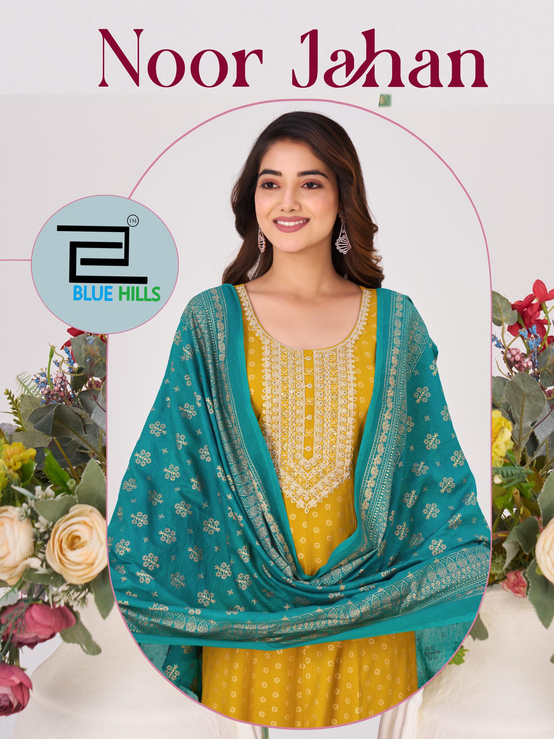 Blue hills noor jahan present new launching rayon foil collection wholesaler and manufacturer in Surat