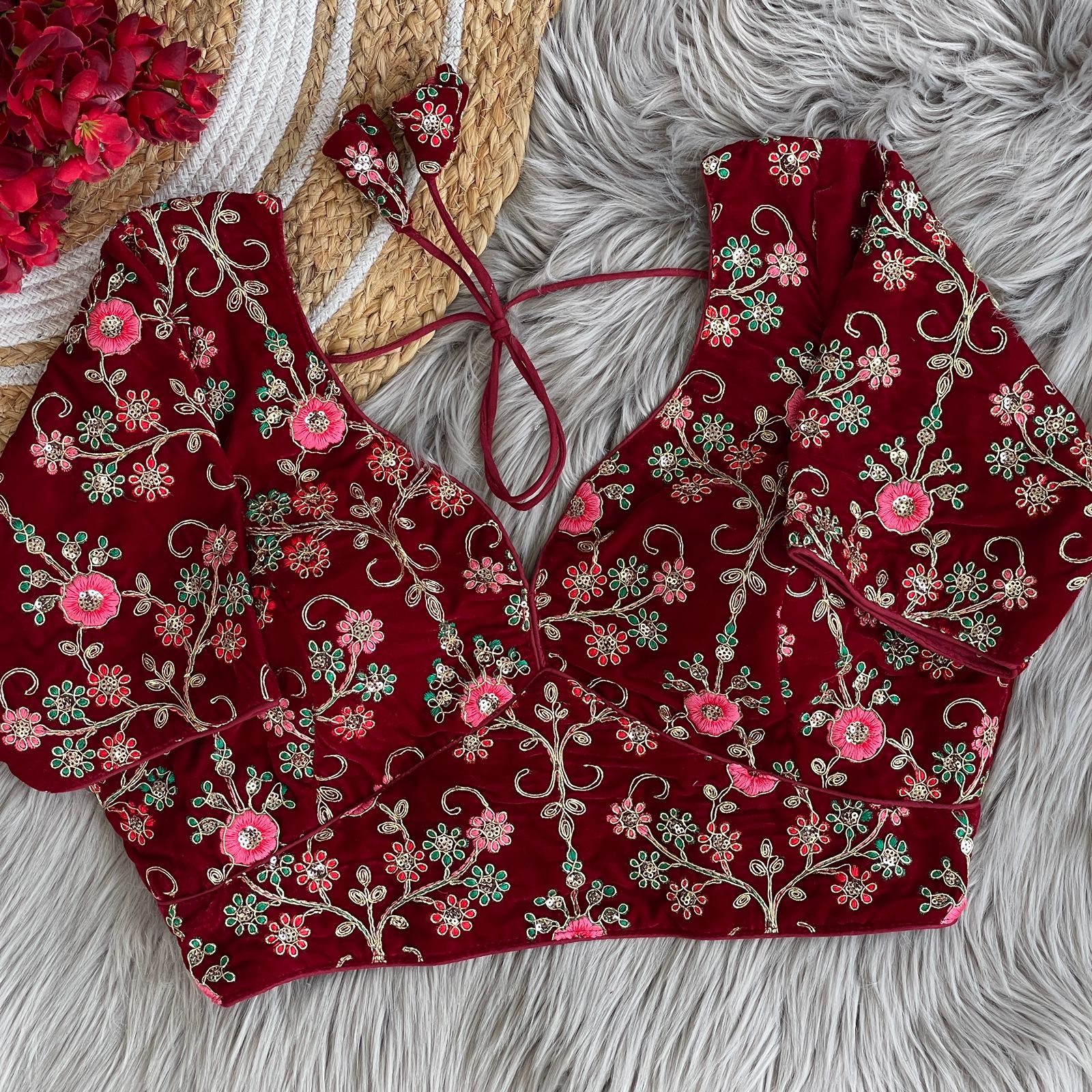 1015 *HEAVY LONG STITCH WORK BLOUSE* *Heavy Embroidery HandWork* *FABRIC*:–Heavy Pure Soft Velvet With Tricot Fuising . *SIZE*:-*Plus Size 40” Ready ulter upto 42 Inch.* *SLEEVES*:- *10 Inch Sleeve* *DESGINE*:- Beautiful Work bridal desgine Heavy Stitching Heavy Padded Handmade Hooks With Beautiful Latkans Front open Style *COLOUR*:– *06* colour available *®️ATE*:– *699/-* *Quality No~1* |