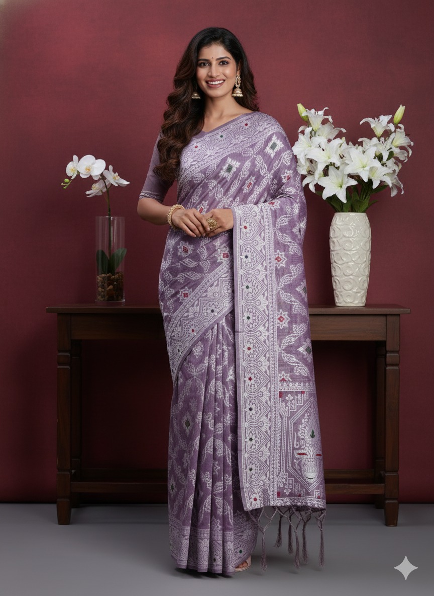 *Catalog Name -Geetanjali* *Rate : 599/-* *+5%GST* *Fabric: Linen Fabric With Designer Woven Work* *Blouse:Linen Fabric* *Occasion: Party Wear, Festival Wear* |