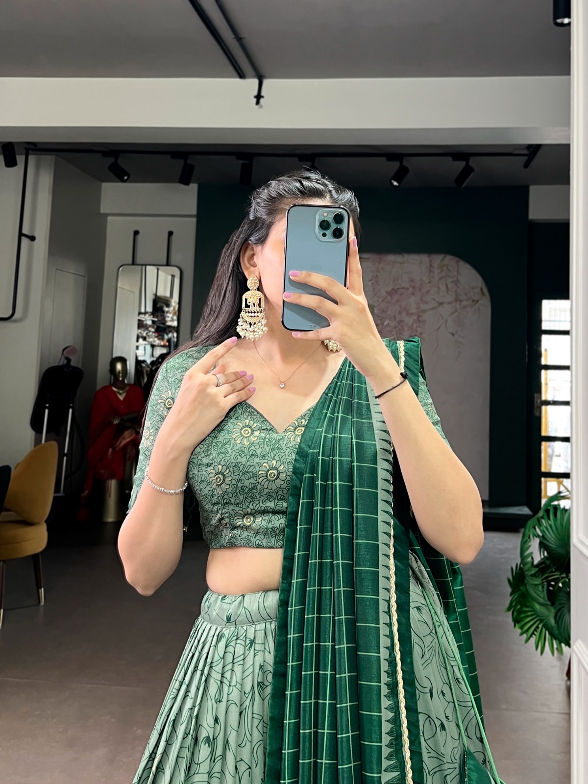*🌷Lehenga Choli🌷* Tradition woven in art — Kalamkari prints on rich Tasar silk finished with elegant lace borders for a timeless ethnic statement 🪷 *Catalogue : ISHANYA-01* *LNB1206GRN* *Lehenga (Stitched)* *Blouse (Unstitched)* *Dupatta* *Package Contain* : Lehenga, Blouse, Dupatta, Drawstring With Zip Weight : 1.300 kg *Price : 1400* |
