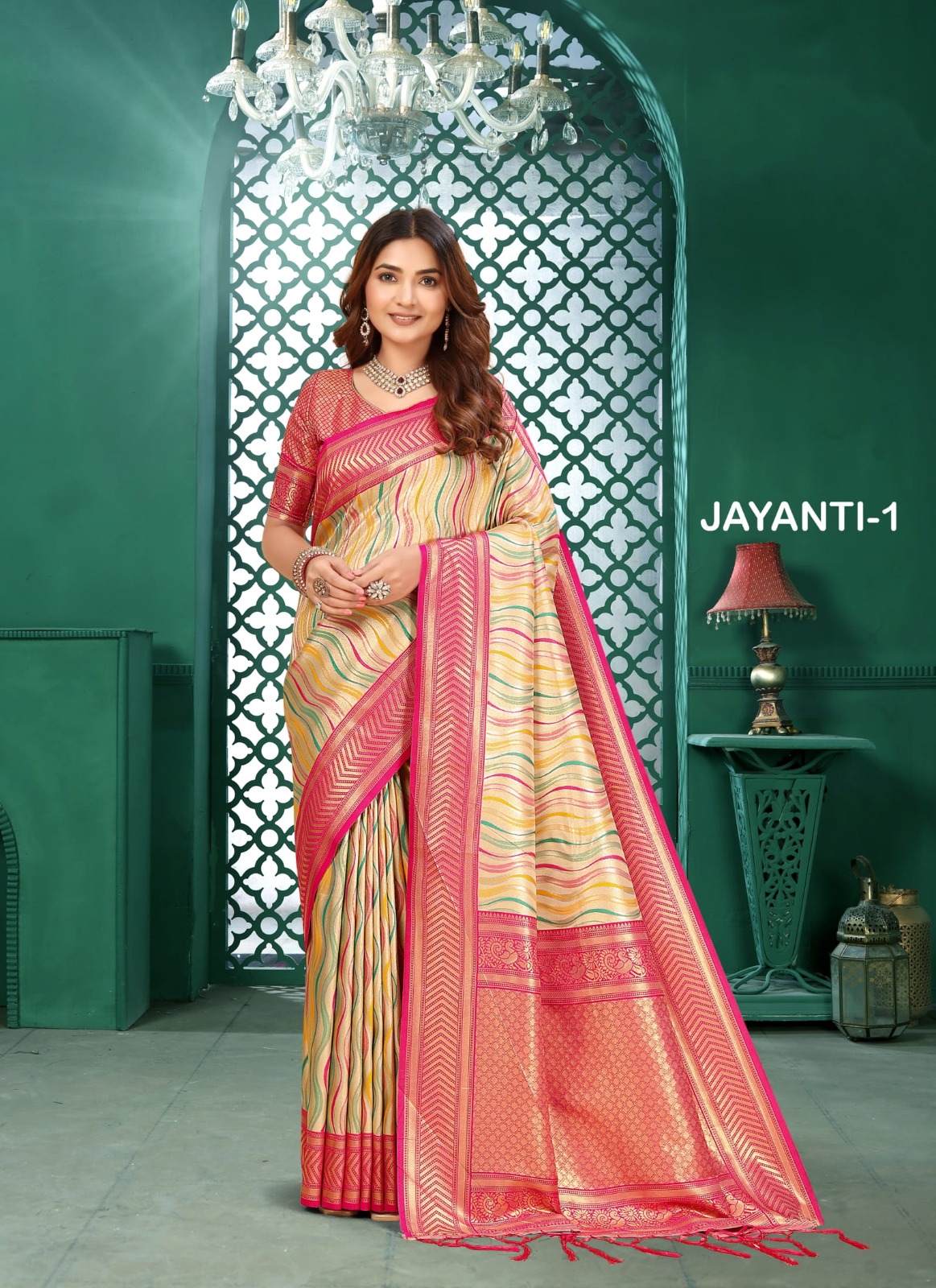 *Catalog : Jayanti* *Series : Jayanti-1 To Jayanti-7* *Saree Fabric Detail : Pure Kanjeevaram Saree Zari Woven Heavy Banarasi Pallu* *Blouse : Contrast Jacquard* *Rate : 2295/- +5 %Gst* |