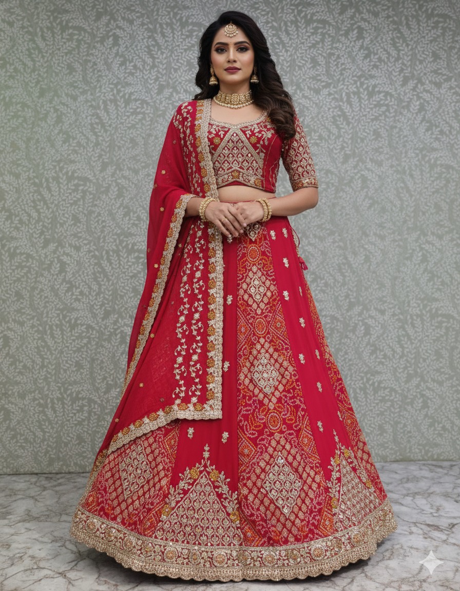 *This Exclusive Lehenga Collection Inculcate A Work Of Lady Likeness United And Exquisiteness In You* *Brand : SL* *Catalog : Designer Lehenga(L-2005 Series)* *Rate : 9095/- + 18% Gst* *Lehenga Fabric : Viscose Georgette With Traditional Bandhani-inspired with floral jaal Cut Work Border ,Zari Work,Stone,Sequence With Embroidery and Gold (zari) Thread work Designer Work All Over Lehenga* *Lehenga Unstitched Size Up to 42 inches With 4 Meter Ghera* *Blouse: Viscose Georgette With Embroidery Work(Unstitched )* *Dupatta : Viscose Georgette With Heavy Work* *Occasion : Wedding Wear, Festival Wear |