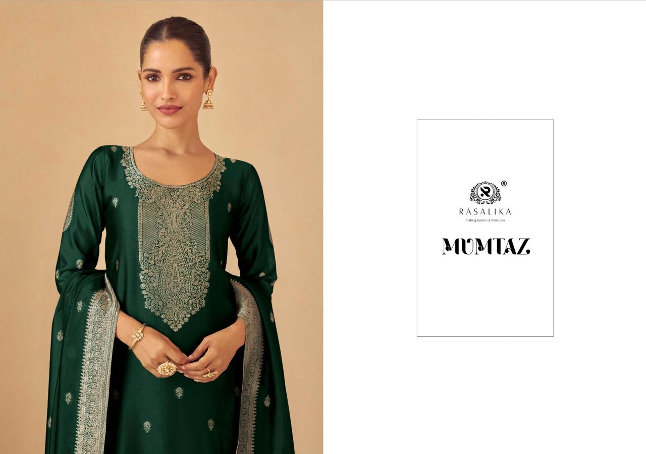 RASALIKA *MUMTAZ* Fabric Detail…!! Top – PREMIUM VISCOSE SILK JACQUARD SOLID DUP – PREMIUM VISCOSE SILK JACQUARD(pure) BOTTOM – HEAVY QUALITY PURE VISCOSE SHANTOON SILK SOLID Rate – 1699/- Unstich suits Celebration wear jacquard series of unstitch suits Limited Stock..!! |