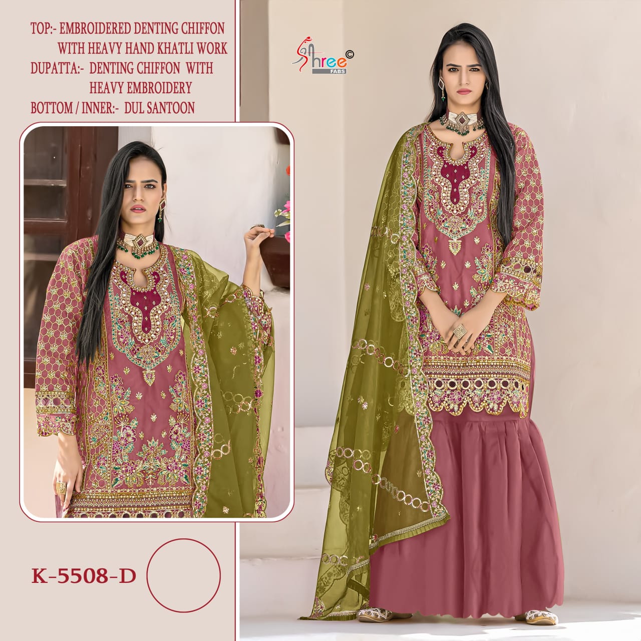 *DESIGN NO.* *K-5508- colour* *FABRICS* *HAND KHATLI* *Cut work* *Bottom/inner* : *santoon dull* *Dupatta* : heavy DINTING Chiffoy with embroidery *Rate-1399- Net* |
