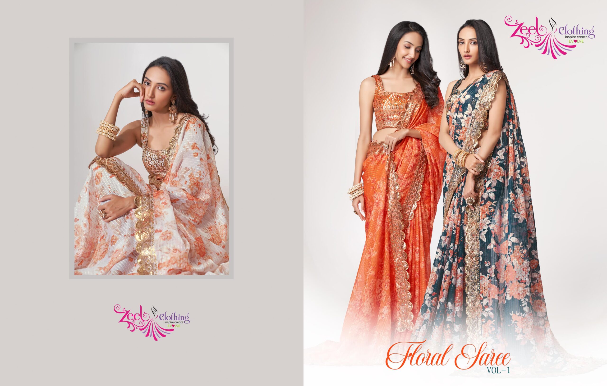Zeel Clothing presents New Catalog of Sarees: Floral Sarees Vol-1 SKU Rate Total 9 Colors Kindly upload asap. |