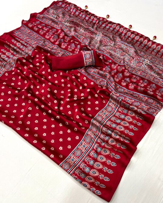 MC brand Ajrakh 012 saree presenting new model satin print collection wholesaler and manufacturer in Surat