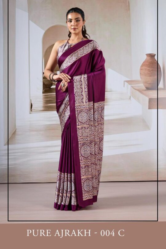 MC brand Ajrakh 004 saree presenting new printed Ajrakh satin crepe collection wholesaler and manufacturer in Surat